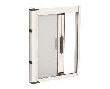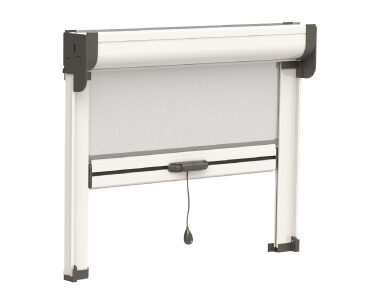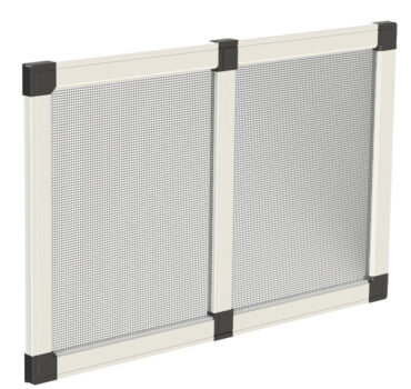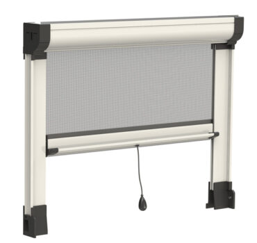 Zanzariera laterale a rete avvolgibile a molla, con bottoncino. Guida bassa a spigoli arrotondati
